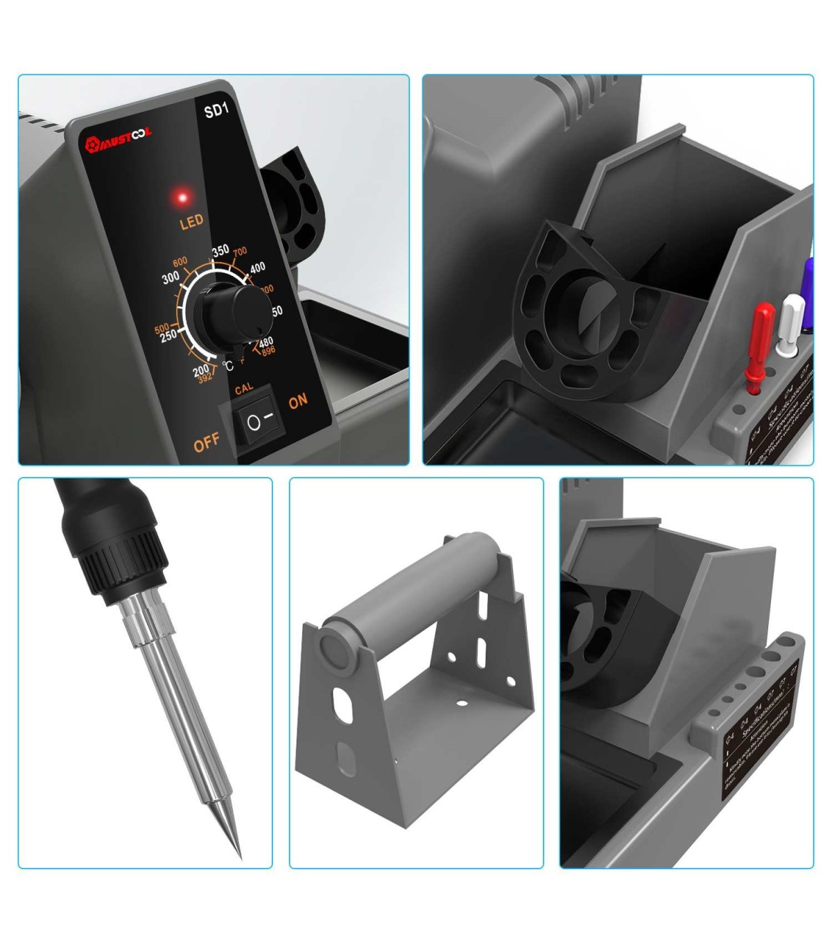 Este kit completo incluye una estación de soldadura de 60 W con soporte para bobina de soldadura de montaje lateral y un soporte para soldador incorporado para descansar la plancha de forma segura.