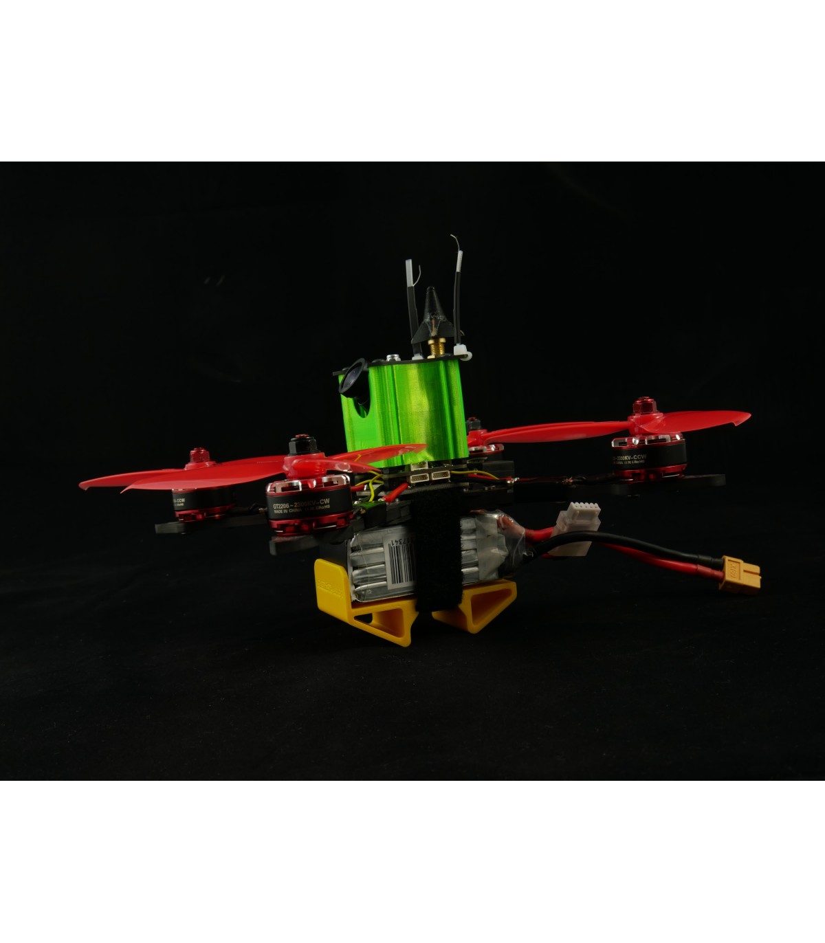 Ce système vous permet de gagner du temps au départ d'une course en n'ayant plus qu'à mettre les gaz! Le drone est directement dans la bonne position. De plus, il permet de protéger la batterie Lipo des chocs.
